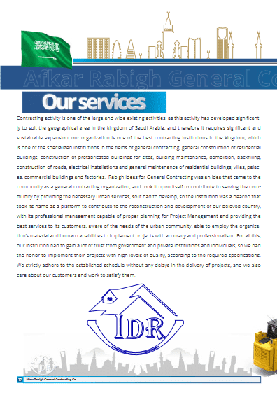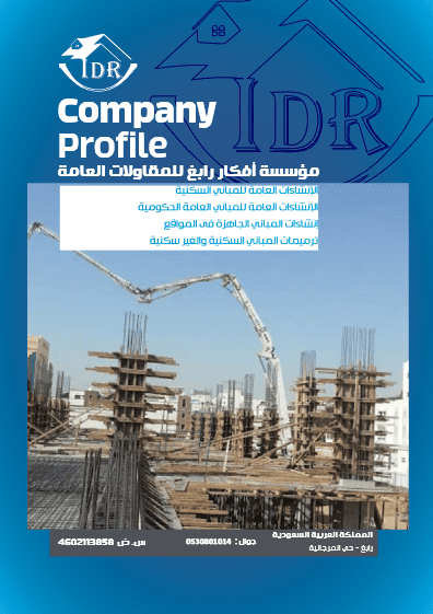 مؤسسة أفكار رابغ للمقاولات العامة لقد تشرفنا في شركتنا بعمل بروفايل مميز احترافي مؤسسة أفكار رابغ للمقاولات العامة مدة تنفيذ البروفايل 3 ايام عدد الصفحات 10 الصفحة لمشاهدة البروفايل كامل pdf تواصل معنا مباشر تواصل معنا الان واحصل علي خصم 50 % علي تصميم البروفايل تواصل معنا واتساب
